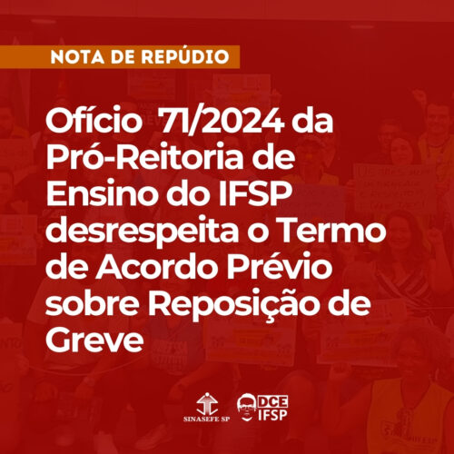 O ofício desrespeita o Termo de Acordo Prévio sobre Reposição de Greve, resultado da negociação entre a Seção São Paulo do Sindicato Nacional dos Servidores Federais da Educação Básica, Técnica e Tecnológica – SINASEFE e o Instituto Federal de Educação, Ciência e Tecnologia de São Paulo – IFSP, assinado em 29 de março de 2024.