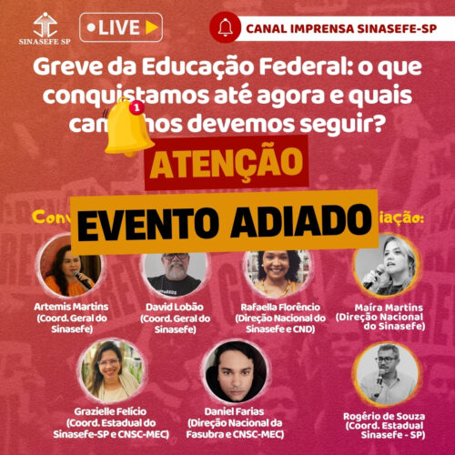 🚨 Em virtude da dificuldade de agenda dos nossos convidados, a Live Greve da Educação Federal: o que conquistamos e quais caminhos devemos seguir? foi adiada.