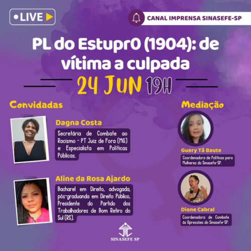 Na segunda-feira, 24 de junho, às 19 horas, o Sinasefe-SP recebe as companheiras Dagna Costa (especialista em Políticas Públicas) e Aline da Rosa Ajardo (advogada e ativista das causas raciais) para debater sobre o absurdo PL do Estupr0 (1904/2024), que revitimiza e criminaliza meninas e mulheres vítimas de violência.