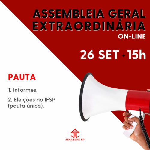 Na tarde desta quinta-feira (26 de setembro), vai acontecer uma nova Assembleia Geral Extraordinária da Seção São Paulo do Sinasefe.