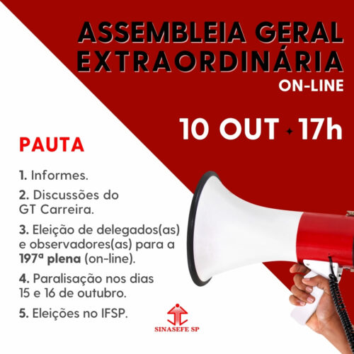 Nesta quinta-feira, 10 de outubro, às 17 horas, vai acontecer mais uma Assembleia Geral do Sinasefe-SP. Em pauta, as discussões do GT Carreira, a eleição de delegados(as) e observadores(as) para a 197ª Plena (on-line), a proposta de paralisação nos dias 15 e 16 de outubro e as eleições no IFSP.