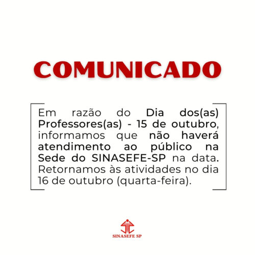 Em razão do Dia dos(as) Professores(as) – 15 de outubro, informamos que não haverá atendimento ao público na Sede do SINASEFE-SP na data. Retornamos às atividades no dia 16 de outubro (quarta-feira).