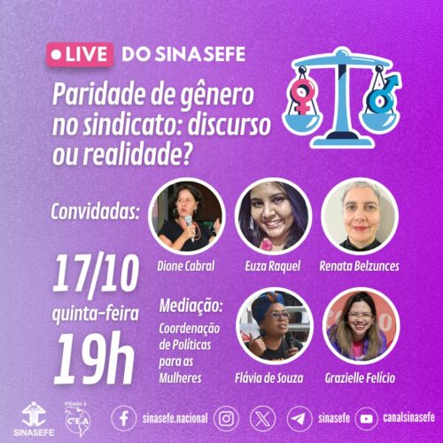 O SINASEFE realizará nesta quinta-feira, 17 de outubro, a partir das 19 horas, a live “Paridade de gênero no sindicato: discurso ou realidade?”.