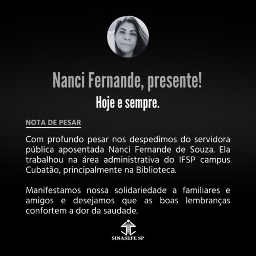Com pesar nos despedimos do servidora pública aposentada Nanci Fernande de Souza. Ela trabalhou na área administrativa do IFSP campus Cubatão, principalmente na Biblioteca.