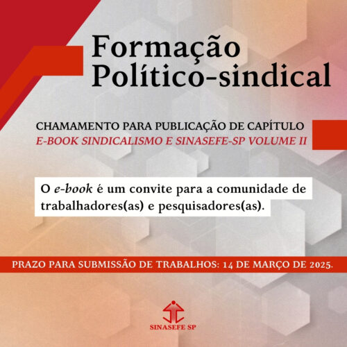 O Sinasefe Seção São Paulo torna público o chamamento para publicação de capítulo no e-book “Sindicalismo e Sinasefe-SP Volume II”. A obra tem o objetivo de fortalecer a formação político-sindical da comunidade acadêmica do IFSP. Um convite para trabalhadoras e trabalhadores que desenvolvem pesquisas e queiram contribuir com esse projeto.