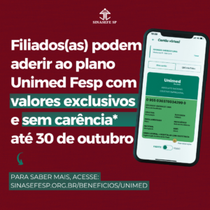 Servidores(as) federais filiados(as) ao Sinasefe-SP podem aderir ao plano de saúde Unimed Fesp até o dia 30 de outubro de 2024 sem carências*. A categoria também tem direito a valores exclusivos!