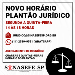 COMUNICADO: NOVO HORÁRIO DO PLANTÃO JURÍDICO DO SINASEFE-SP Segunda a quinta-feira 14 às 18 horas Contatos: [email protected] (11)2539-9551 (Whatsapp) Agendamento de reuniões: quartas e quintas-feiras no horário do plantão