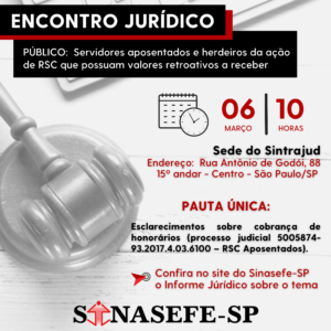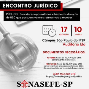 ENCONTRO JURÍDICO | O Sinasefe-SP convoca os aposentados do IFSP que possuam valores a receber referentes ao retroativo do processo de Reconhecimento de Saberes e Competências (RSC) para uma reunião presencial com a assessoria jurídica do Escritório...