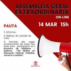 🚨 14.03 | ASSEMBLEIA GERAL EXTRAORDINÁRIA 🚩 🗓️ Sexta-feira ⏱️ 15h 🛜 on-line | Plataforma Zoom PAUTA 1. Informes. 2. Balanço da Jornada de Lutas. 3. Inscrição das vagas remanescentes da seção São Paulo para participação no I Encontro de Mulheres - Sudeste: “Ser Mulher...