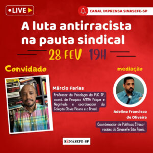 A Live “A luta antirracista na pauta sindical” será transmitida ao vivo pelo canal Imprensa SinasefeSP no youtube, a partir das 19 horas.