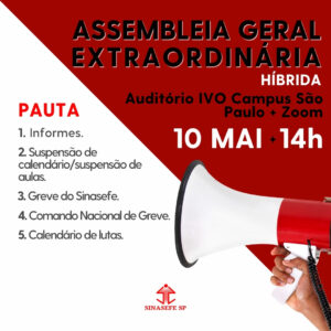 🚨 10.05 | ASSEMBLEIA GERAL EXTRAORDINÁRIA 🚩 🗓️ 10 de MAIO (sexta-feira) ⏱️ 14h 🛜 híbrida | Auditório IVO + Plataforma Zoom PAUTA 1. Informes. 2. Suspensão de calendário/suspensão de aulas. 3. Greve do Sinasefe. 4. Comando Nacional de Greve. 5. Calendário de lutas. ✊🏿 PARTICIPE! Inscreva-se no...