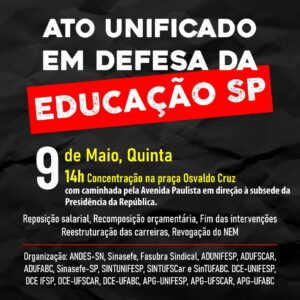 Nesta quinta-feira, 9 de maio, a partir das 14 horas, as Entidades Federais de Ensino do Estado de São Paulo promovem ato unificado em defesa da Educação e dos(as) servidores(as), que estão em greve por melhores condições de trabalho,...
