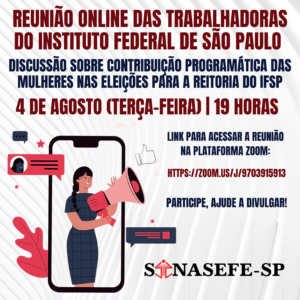 Discussão sobre contribuição programática das mulheres nas eleições para a reitoria do IFSP 4 de agosto (terça-feira) 19 horas Link de acesso: https://zoom.us/j/9703915913