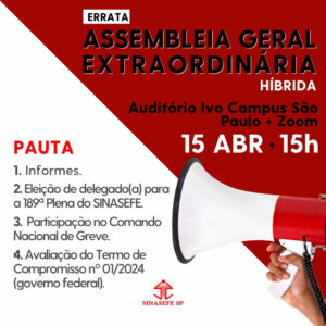 15.04 | ASSEMBLEIA GERAL EXTRAORDINÁRIA ️ 15 de ABRIL (segunda-feira) ⏱️ 15h híbrida | Auditório Ivo Campus São Paulo + Zoom PAUTA 1. Informes 2. Eleição de delegado(a) para a 189ª Plena do SINASEFE 3. Participação no Comando Nacional de Greve 4. Avaliação do Termo de...