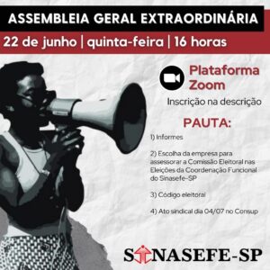 22 de junho (quinta-feira) 16H Participação on-line através da Plataforma Zoom. PAUTA: 1) Informes 2) Escolha da empresa para assessorar a Comissão Eleitoral nas Eleições da Coordenação Funcional do Sinasefe-SP 3) Código eleitoral 4) Ato sindical dia 04/07 no Consup COMO PARTICIPAR DA AGE VIRTUALMENTE? Como...
