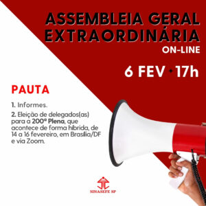 Na tarde desta quinta-feira (6 de fevereiro), vai acontecer a 1ª Assembleia Geral Extraordinária da Seção São Paulo do Sinasefe deste ano. As e os participantes devem discutir sobre a participação na 200ª Plenária Nacional do Sindicato. 🚨 06.02 |...