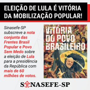 Eleição de Lula é vitória da mobilização popular! | Sinasefe-SP subscreve a nota conjunta das Frentes Brasil Popular e Povo Sem Medo sobre a eleição de Lula para a presidência da República com mais de 60 milhões de votos. Para...