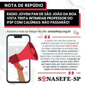 NOTA DE REPÚDIO | JOVEM PAN DE SÃO JOÃO DA BOA VISTA TENTA INTIMIDAR PROFESSOR DO IFSP COM CALÚNIAS, NÃO PASSARÃO! Durante a edição regional do programa "Jornal da Manhã" de São João da Boa Vista (SP), veiculada no dia...