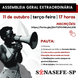 ASSEMBLEIA GERAL EXTRAORDINÁRIA (AGE) VIRTUAL 🗓️ 11 DE OUTUBRO (terça-feira) ⏱️ 17 horas 🚩 PAUTA: 1) Informes; 2) Realização de AGEs no formato híbrido; 3) Luta contra o ponto eletrônico: Educação não se mede em horas! 4) Mobilizações contra ataques do governo Bolsonaro; 5) 18 de outubro:...