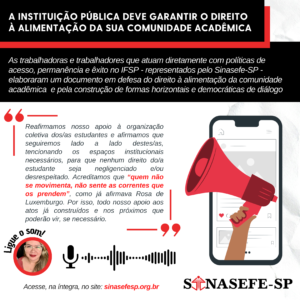 As trabalhadoras e trabalhadores que atuam diretamente com políticas de acesso, permanência e êxito no IFSP - representados pelo Sinasefe-SP - elaboraram um documento em defesa do direito à alimentação da comunidade acadêmica e pela construção de formas horizontais...