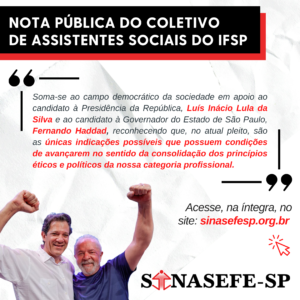 O Coletivo de Assistentes Sociais do Instituto Federal de Educação, Ciência e Tecnologia de São Paulo – IFSP, neste momento crucial de nossa história em que conquistas sociais resultantes de muitas lutas da classe trabalhadora se colocam em risco,...