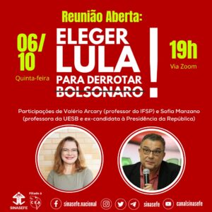 ELEGER LULA! 🦑 AO VIVO 🔴 🙋♀️🙋♂️ Participe da Reunião Aberta do SINASEFE: Eleger Lula para derrotar Bolsonaro! 📆 06/10/2022 (quinta-feira) 🕖 19:00 💻 Virtual pelo Zoom 🎥 Transmissão pelo Facebook ✅ Como presenças já confirmadas para fazer exposições sobre a conjuntura política, teremos Valério...