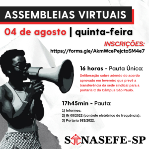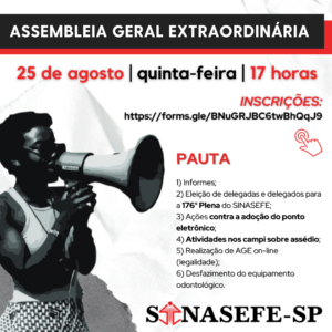 🚨📢 ASSEMBLEIA GERAL EXTRAORDINÁRIA (AGE) VIRTUAL 🗓️ 25 DE AGOSTO (quinta-feira) ⏱️ 17 HORAS 🚩 PAUTA: 1) Informes; 2) Eleição de delegadas e delegados para a 176° Plena do SINASEFE; 3) Ações contra a adoção do ponto eletrônico; 4) Atividades nos campi sobre assédio; 5) Realização de...