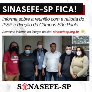 SINASEFE-SP FICA! Informe sobre a reunião com a reitoria do IFSP e direção do Câmpus São Paulo Na última segunda-feira, 1º de agosto, a Coordenação Funcional do Sinasefe-SP, representada pelos coordenadores Márcio Alves e João Pacheco, participou de uma reunião...