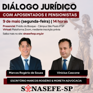 DIÁLOGO JURÍDICO COM APOSENTADOS E PENSIONISTAS DO SINASEFE-SP 🗓️ Data: 9 de maio (segunda-feira) 🕑 Horário: 14 horas 🎦🚩 FORMATO HÍBRIDO: 🎦 Virtual: Plataforma Zoom, mediante INSCRIÇÃO PRÉVIA Formulário online e instruções abaixo. 🚩 Presencial: Prédio do Bosque /IFSP Câmpus São Paulo Rua Pedro Vicente, 625...