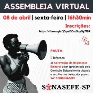 ASSEMBLEIA GERAL EXTRAORDINÁRIA (AGE) VIRTUAL 🗓️ 31 DE MARÇO (quinta-feira) 🕓 16 HORAS 🚩 PAUTA: 1) Informes; 2) Resultado final do encaminhamento sobre a tomada de preços para escolha do escritório jurídico do Sinasefe-SP; 3) Deliberação sobre a paralisação do Sinasefe-SP dia 04 de abril...