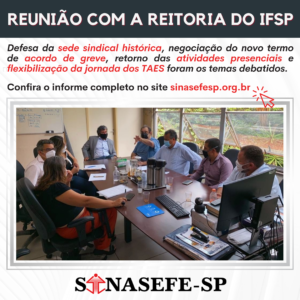 Na última quinta-feira, 03 de fevereiro, representantes sindicais do Sinasefe-SP participaram de uma reunião com Silmário Batista (reitor do IFSP), Marcelo Cavaletti (procurador federal) e a equipe gestora da instituição. Nosso sindicato estava representado pelos coordenadores Denilza Frade (Assuntos...