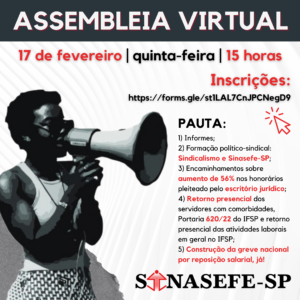 🚩 PAUTA: 1) Informes; 2) Formação político-sindical: sindicalismo e SINASEFE-SP; 3) Encaminhamentos sobre aumento de 56% nos honorários pleiteado pelo escritório jurídico; 4) Retorno presencial dos servidores com comorbidades, portaria 620/22 do IFSP e retorno presencial das atividades laborais em geral no IFSP; 5)...
