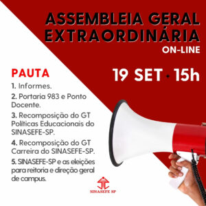 Nesta quinta-feira (19 de setembro), o Sinasefe Seção São Paulo realizará nova assembleia da categoria. A atividade será on-line, com transmissão ao vivo pelo Youtube do sindicato. Confira os detalhes abaixo e participe. 🚨 19.09 | ASSEMBLEIA GERAL EXTRAORDINÁRIA 🚩 🗓️...