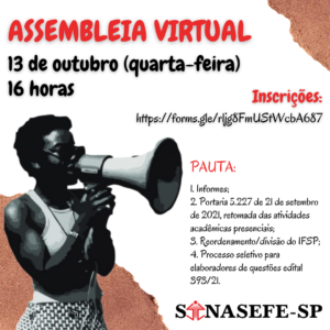 📢🚨 13 DE OUTUBRO: ASSEMBLEIA GERAL EXTRAORDINÁRIA (AGE) VIRTUAL 🕓16 HORAS: PAUTA: 1. Informes; 2. Portaria 5.227 de 21 de dezembro de 2021, retomada das atividades acadêmicas presenciais; 3. Reordenamento/divisão do IFSP; 4. Processo seletivo para elaboradores de questões edital 393/21. 🙋🏿♀️🙋🏽♂️🙋🏻♀️ COMO PARTICIPAR DA AGE?...