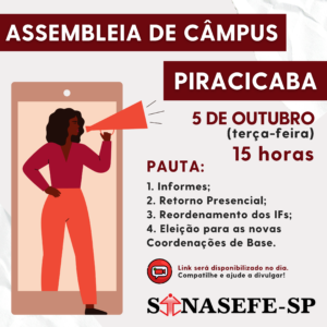 🚨📢 PIRACICABA | ASSEMBLEIA DE CÂMPUS 🗓️ 5 de outubro (terça-feira) 🕕 15 horas PAUTA: 1. Informes; 2. PEC 32; 3. Reordenamento dos IFs; 4. Eleição para as novas Coordenações de Base. 🎦 Link será disponibilizado no dia. 😉 Compartilhe e ajude a divulgar! 🖱️📑 SAIBA MAIS: Acesse o...