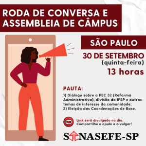 🚨📢 SÃO PAULO | RODA DE CONVERSA E ASSEMBLEIA DE CÂMPUS 🗓️ 30 de setembro (quinta-feira) 🕔 13 horas PAUTA: 1) Diálogo sobre a PEC 32 (Reforma Administrativa), divisão do IFSP e outros temas de interesse da comunidade; 2) Eleição das Coordenações de Base. 🎦...