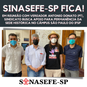 SINASEFE-SP FICA! | Em reunião com vereador Antonio Donato (PT-SP), sindicato busca apoio para permanência da sede histórica no Câmpus São Paulo do IFSP Na última terça-feira (14), representantes do Sinasefe-SP participaram de uma reunião com o vereador Antonio Donato...