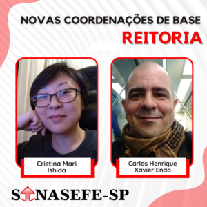 NOVAS COORDENAÇÕES DE BASE DO SINASEFE-SP | REITORIA Em assembleia local realizada na última quarta-feira (9 de setembro), as trabalhadoras e trabalhadores da Reitoria elegeram Cristina Mari Ishida e Carlos Henrique Xavier Endo como Coordenadores de Base do nosso sindicato. 🖱️📑...