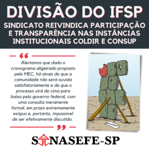 DECISÃO DE DIVISÃO É PRERROGATIVA DA COMUNIDADE DO IFSP Na manhã da quinta-feira passada, dia 26 de agosto, o Sinasefe-SP tomou ciência - de maneira informal - que onze reitores dos Institutos Federais, incluindo o IFSP, foram convocados a participar...