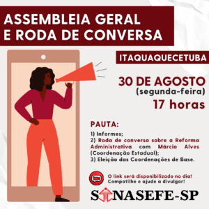 ITAQUAQUECETUBA | ASSEMBLEIA GERAL E RODA DE CONVERSA SOBRE A REFORMA ADMINISTRATIVA 30 de agosto (segunda-feira) 17 horas PAUTA: 1) Informes 2) Formação sindical: Roda de conversa sobre a Reforma Administrativa com Márcio Alves (Coordenação Estadual); 3) Eleição das Coordenações de Base; O link será disponibilizado...