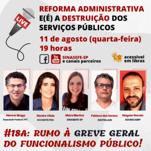 REFORMA ADMINISTRATIVA E(É) A DESTRUIÇÃO DOS SERVIÇOS PÚBLICOS Na próxima quarta-feira (11 de agosto), às 19 horas, vamos debater a Proposta de Emenda à Constituição (PEC) 32/2020, a Reforma Adminsistrativa. Contaremos com a presença de dirigentes sindicais e parlamentares, confira: ALENCAR...
