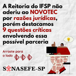 A Reitoria do IFSP não aderiu ao Novotec devido a problemas jurídicos, porém ressaltamos 9 questões críticas envolvendo essa possível parceria, com destaque para a ameaça aos princípios pedagógicos da politecnia e à gestão democrática e participativa praticada na...