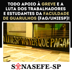 O Sinasefe-SP manifesta solidariedade ao movimento paredista e repudia a forma intransigente que o grupo UNIESP S.A conduz as negociações. Vale ressaltar que os docentes deflagraram greve por melhores condições de trabalho e pelo não pagamento de direitos básicos...