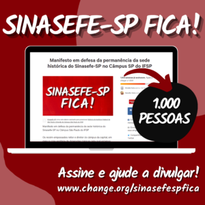 SINASEFE-SP FICA! | Manifesto em defesa da permanência da sede histórica do Sinasefe-SP no Câmpus SP do IFSP atinge 1.000 assinaturas! Nossa campanha ganhou repercussão nacional! Atingimos a marca de 1.000 contribuições no abaixo-assinado virtual, além do importante apoio de...