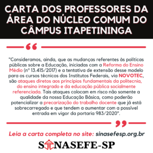 CARTA ABERTA À COMUNIDADE IFSP-ITP Nós, professores da Área do Núcleo Comum, em reunião realizada via plataforma Google Meet, nesta data, decidimos, coletivamente e por unanimidade, tornar pública a presente carta aberta a toda comunidade do IFSP, sobre a possível...