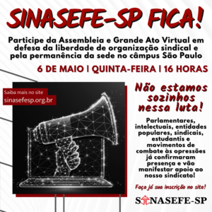 Na próxima quinta-feira, 6 de maio, serão realizadas duas assembleias virtuais: 15 horas - PAUTA ÚNICA: Retomada do cronograma referente às eleições sindicais do Sinasefe-SP; 16 horas - ASSEMBLEIA E GRANDE ATO POLÍTICO - Em defesa da liberdade de organização sindical...