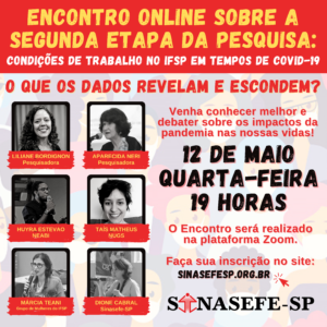 ENCONTRO ONLINE SOBRE A SEGUNDA ETAPA DA PESQUISA: CONDIÇÕES DE TRABALHO NO IFSP EM TEMPOS DE COVID-19 O QUE OS DADOS REVELAM E ESCONDEM? Convidamos toda a comunidade acadêmica para um Encontro Online na próxima quarta-feira, 12 de maio,...