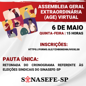 ATENÇÃO! DIA 6 DE MAIO (QUINTA-FEIRA) SERÃO REALIZADAS DUAS ASSEMBLEIAS VIRTUAIS: 🕒 15 HORAS: 🚩🗳️ PAUTA ÚNICA: Retomada do cronograma referente às eleições sindicais do Sinasefe-SP. 🕓 16 HORAS: 🚩 PAUTA: 1) Informes; 2) Pedido oficial da Reitoria e Direção do câmpus São Paulo para...