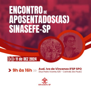 No dia 11 de dezembro temos um encontro marcado com as aposentadas e os aposentados da Seção São Paulo do Sinasefe. O Encontro será no auditório Aldo Ivo de Vincenzo, no IFSP campus São Paulo, a partir das 9...