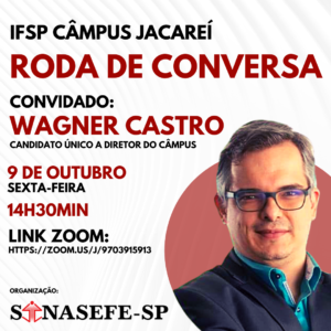 A Coordenação de Base do Sinasefe-SP Câmpus Jacareí convida a comunidade acadêmica para uma RODA DE CONVERSA com a participação de WAGNER CASTRO, candidato único ao cargo de diretor do câmpus. MARQUE NA AGENDA! 9 DE OUTUBRO (sexta-feira) 14h30min Link Zoom: https://zoom.us/j/9703915913